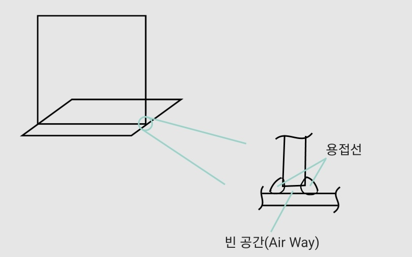필렛 용접 특성 상 사진과 같이 미세한 틈이 존재하게 되는데 용접선에 결함이 있을 경우 인접 밀폐구역으로 유체가 이동할 수가 있다. 그래서 경계면에 스탑홀을 시공하여 빈 공간을 용접으로 채워 유체 이동을 막는 것이 스탑홀의 원리이다.